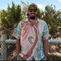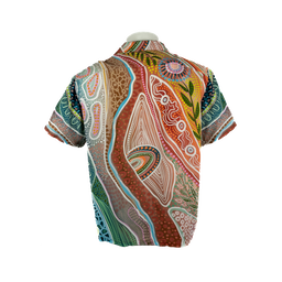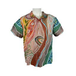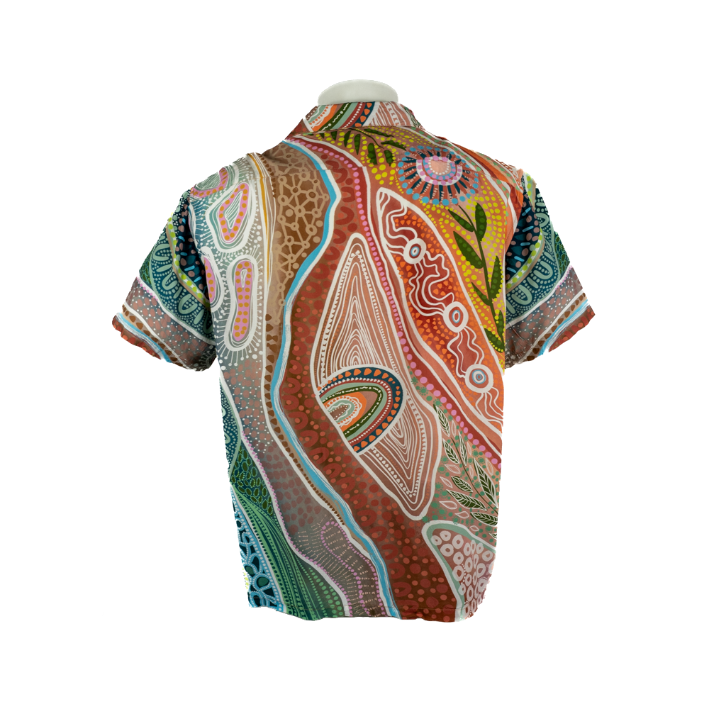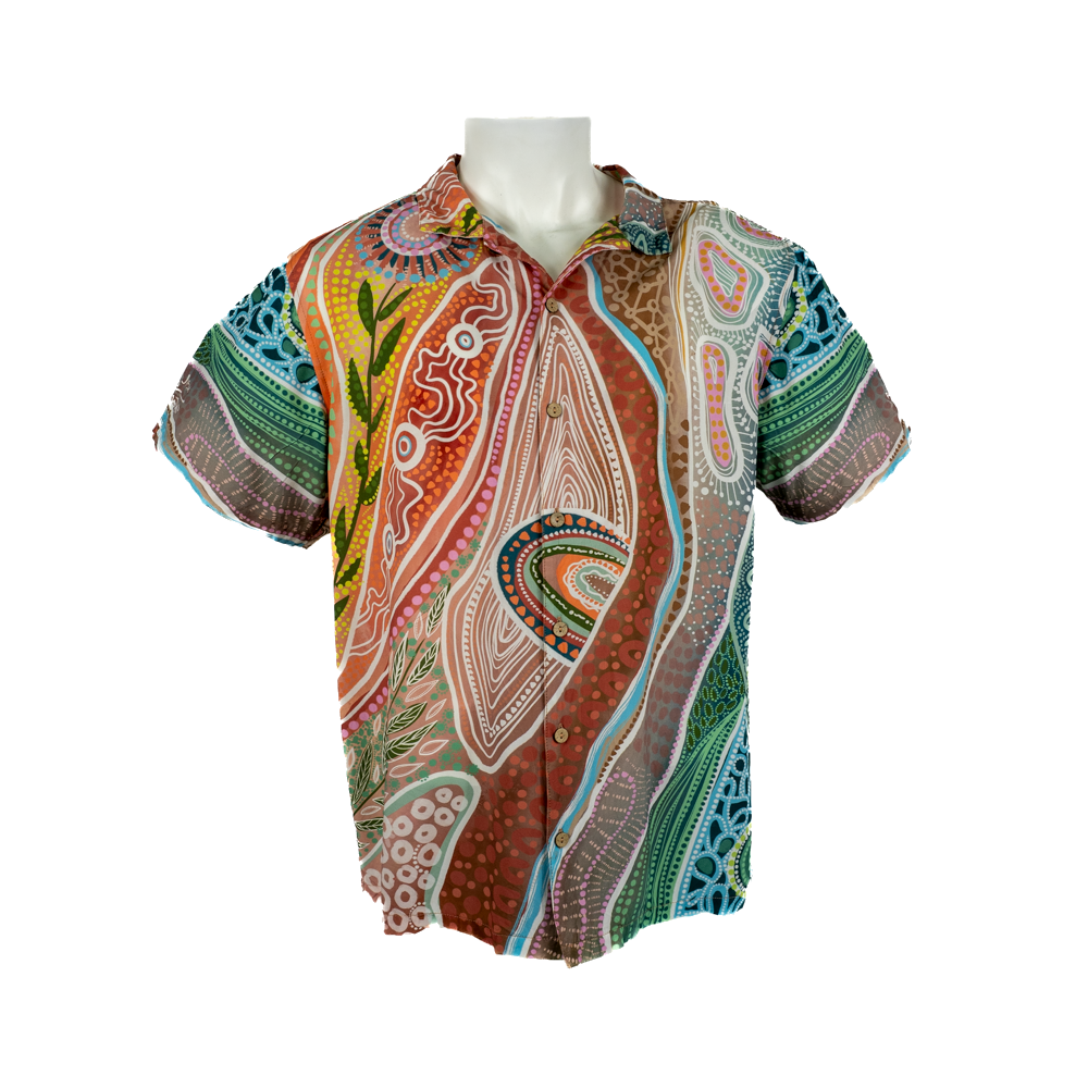 Created for Jatu by renowned Ngarluma, Kariyarra, Nyul Nyul and Yawuru artist Bobbi Lockyer, this Aloha style shirt features warm earth tones and will surely brighten your day.